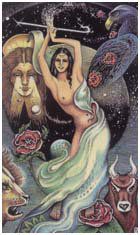 Kékes szürke, csillagokkat teli univerzum a háttérben, és egy kitárulkozó, szabad és légies nőalak a kép közepén. Oldalán a sas, bika, oroszlán és ember/angyal szimbólumaival a teljességet, a mindent magába foglalót (szeretet, igazságosság, erő, bölcsesség) testesíti meg. A Világban megtalált és elfoglalt igazi helyed.